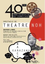 Dans le cadre du 40ème anniversaire du jumelage entre Nancy et Kanazawa, la troupe du théçtre de Nô de Kanazawa, composée de 30 artistes, a offert un spectacle du théçtre Nô (durée 1h30), le 29 septembre 2013.