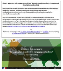 Le ministère des Affaires étrangères et du Développement international a lancé une campagne numérique : « La coopération décentralisée s’engage pour le climat » le 3 novembre dernier, sur le site internet France Diplomatie, et relayée sur l’ensemble des réseaux sociaux du ministère : (…)